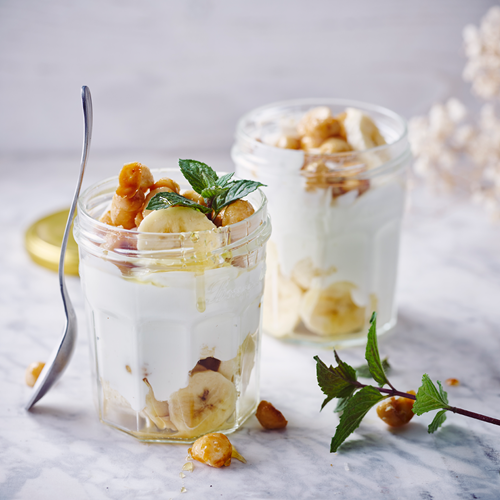 Il m’est déjà arrivé de chiper un cookie dans la boîte à biscuits de ma fille. Ou de manger un gâteau d’anniversaire, joliment emballé par ailleurs, d’une de ses copines de classe. Cette soudaine fringale me guette à chaque coin de rue. Tel un alligator pratiquement invisible dans l’eau du bayou. En silence, prêt à foncer sur sa proie. Ces envies soudaines me poussent régulièrement à entreprendre des tentatives désespérées afin de les satisfaire. Pour éviter cela, je tente désormais d’anticiper la faim. Ou de prévoir quelques alternatives toutes faites, et plus saines. Réservées aux situations d’urgence. Comme ce yaourt à la banane, au miel et aux noix de macadamia caramélisées. Autant d’ingrédients que j’ai toujours à la maison et qui, lorsqu’ils sont harmonieusement assemblés, constituent une collation délicieuse et salvatrice. Joliment conservés en sécurité dans un bocal.